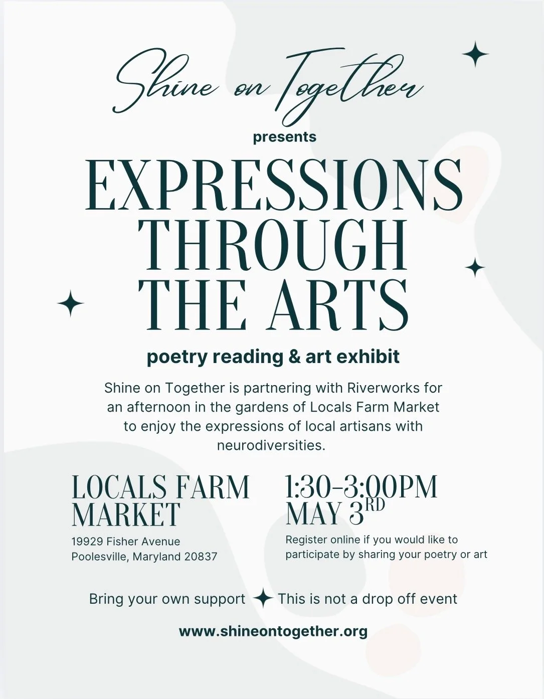 Shine on Together is partnering with Riverworks for an afternoon in the gardens of Locals Farm Market to enjoy the expressions of local artisans with neurodiversities .